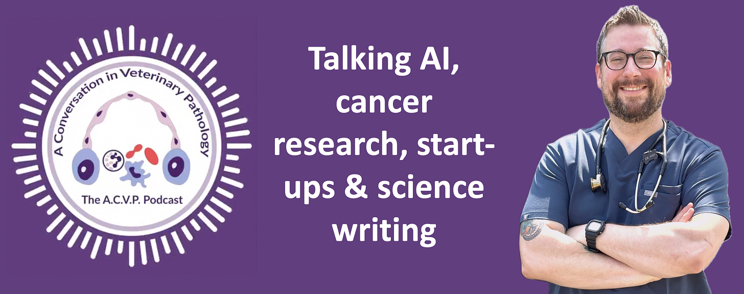 A while back1, I mentioned that I was being interviewed for the podcast A Conversation in Veterinary Pathology and today it finally came out! In this episode, I share my professional journey from vet school at Western University through a rotating internship at Virginia Tech, working in the ER, and a combined pathology residency/PhD at Auburn University, where I studied dogs with mammary tumors as a model for women with breast cancer.
