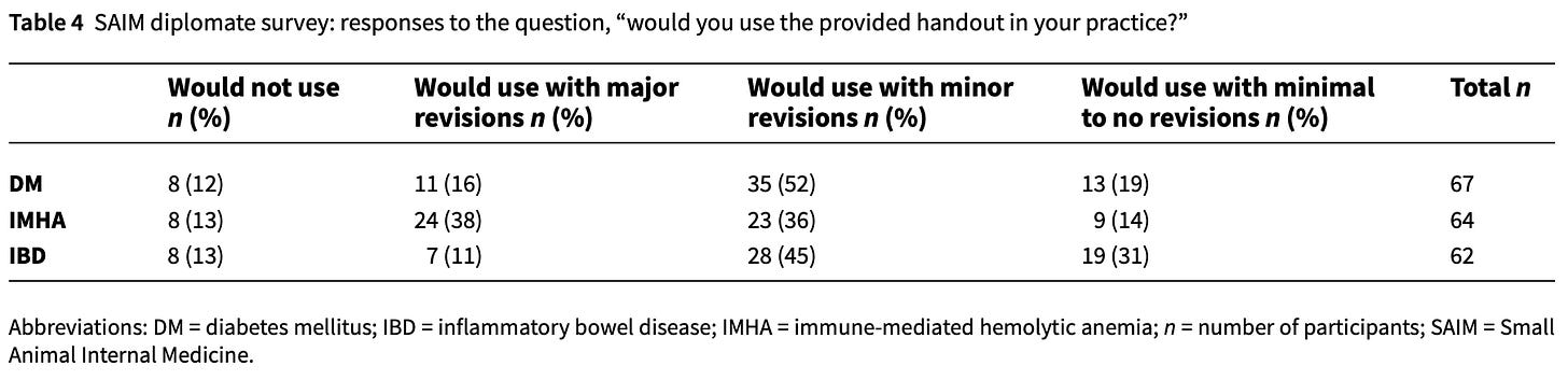 Okay, you might be thinking, itâs great if pet owners like it, but do veterinarians think they are accurate?? To answer that, the second part of this study asked 67 internal medicine specialists to assess the AI summaries. The majority of respondents indicated they would use them with minor or minimal/no changes (76% for IBD, 71% for DM, and 50% for IMHA); only 12-13% said they would not use them at all. Table 4 shows the distribution of opinions. The median accuracy score for all three handouts was 4/5. The medicine specialists did provide feedback on content they thought should either be added or removed, as well as general feedback on grammar and medical terminology.