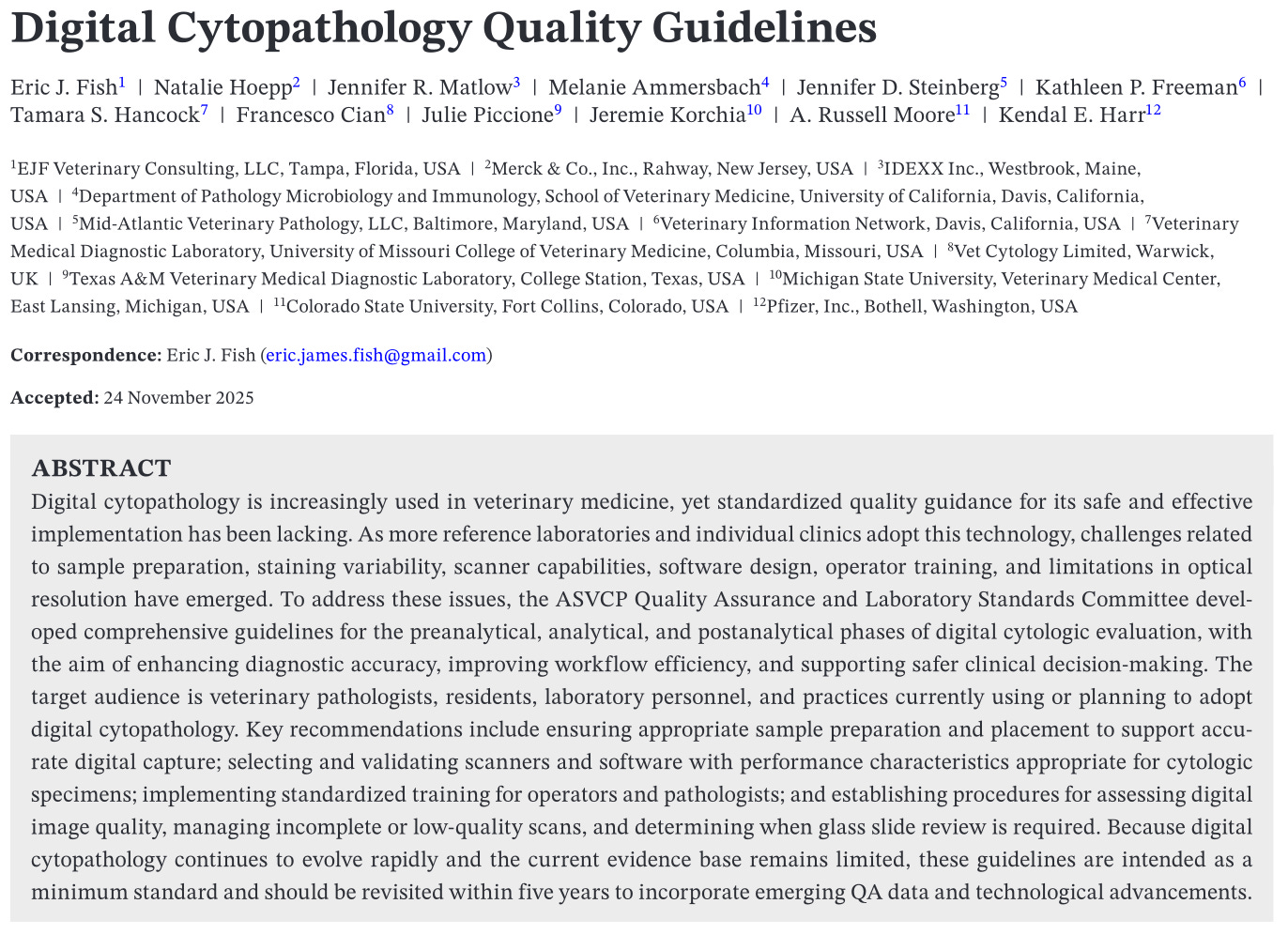 Fish EJ, Hoepp N, Matlow JR, Ammersbach M, Steinberg JD, Freeman KP, Hancock TS, Cian F, Piccione J, Korchia J, Moore AR, Harr KE. Digital Cytopathology Quality Guidelines. Vet Clin Pathol. 2026 Jan 6.
