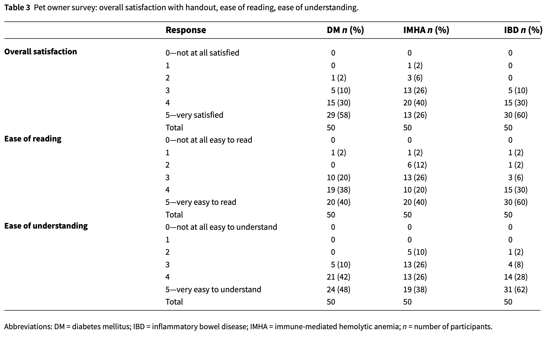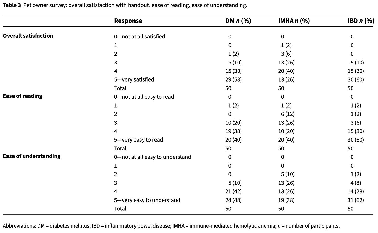 In brief, researchers at NC State and the University of Tennessee used ChatGPT-3.5 to generate client educational handouts for three common diseases (canine diabetes, feline inflammatory bowel disease, and canine immune-mediated hemolytic anemia).3 They took the outputs and asked 50 pet owners how useful and understandable they were. A pre-study survey showed that the vast majority of these clients had either not heard of the diseases or knew little about them. The data showed that owners had a significant increase in their understanding of them after reading the AI summaries. Their median satisfaction scores with the documents (graded from 0 to 5, with 5 being the best) were 4/5 for two of them (diabetes and IMHA) and 5/5 for IBD. The full pet owner survey results are summarized below in Table 3.